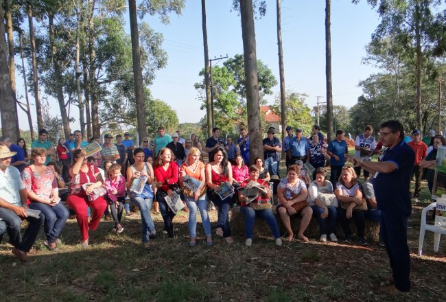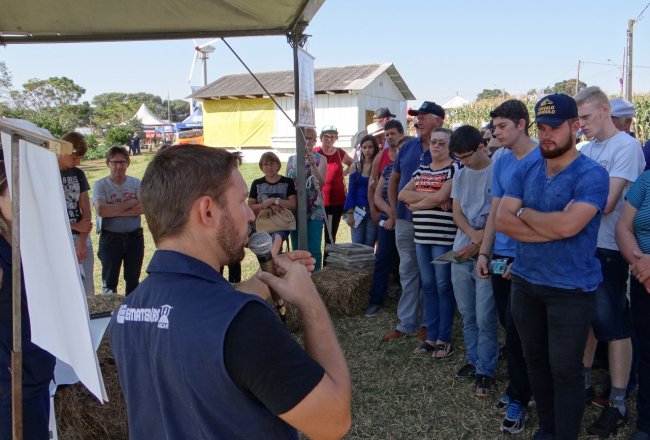 Em torno de 1.500 agricultores participaram dos dias de campo promovidos pela Emater/RS-Ascar, na área da Exporural, durante a Feira Nacional da Soja (Fenasoja 2018), em Santa Rosa. Nos eventos realizados de 02 a 04/05 foram conduzidas estações sobre segurança e soberania alimentar, com ênfase em tecnologias para produção de autoconsumo, energias renováveis, manejo integrado de pragas e doenças (MIP/MID), controle biológico na cultura da soja (em parceria com Unicooper e Arede) e gestão na atividade leiteira, com orientações transversais na área de solos.
