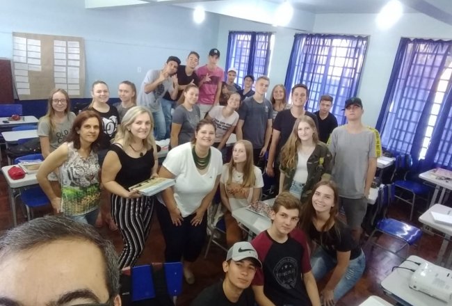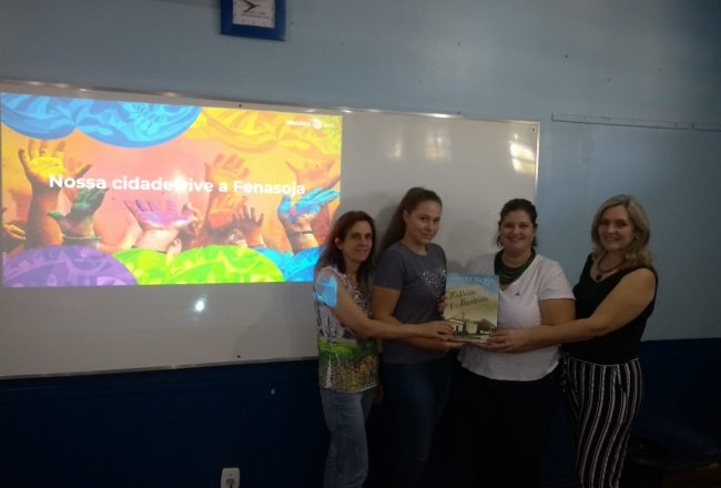 Na quarta-feira, 11, atendendo ao pedido da direção da Escola Carlos Gaklik, do município de Senador Salgado Filho, Daiane, acompanhada com o vice-presidente da FENASOJA, Rogério Ferreira esteve no educandário. "Foi um momento muito especial, pois falamos um pouco do projeto e da história da feira e sua importância para o desenvolvimento regional", explicou.