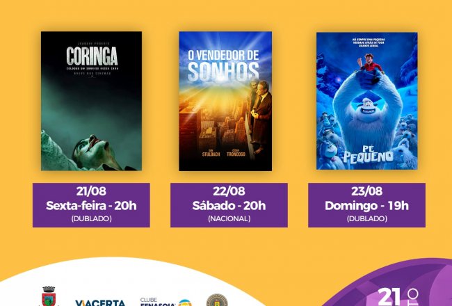 (21/08) às 20h, O Vendedor de Sonhos (22/08) às 20h, e Pé Pequeno (23/08) às