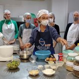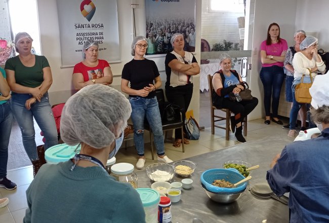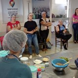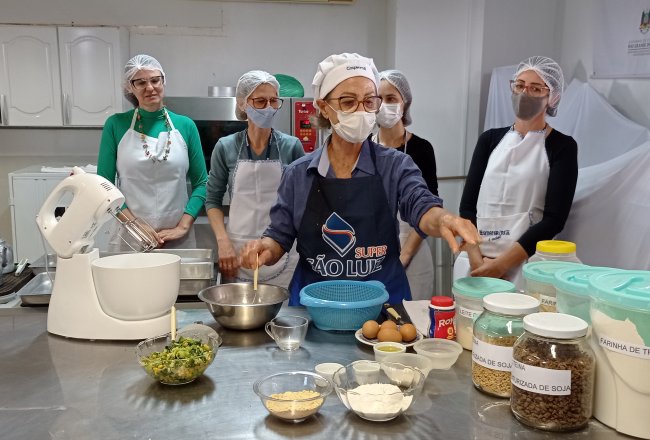 Nesta sexta-feira (29/04), a equipe da Cozinha da Soja recebeu servidoras responsáveis pela alimentação escolar da rede pública de ensino de Santa Rosa. As merendeiras aprenderam as receitas de empadinhas salgadas, palito de cebola com salsa e bolo de legumes com derivados de soja. A ideia é incorporá-las no cardápio oferecido aos estudantes.