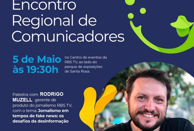 O encontro regional de comunicadores deve reunir cerca de 50 profissionais de vários veículos de comunicação da Região da Fronteira Noroeste, na próxima quinta-feira (05 de maio), durante a Fenasoja 2022. Rodrigo Muzell, gerente de produto do jornalismo da RBS TV, é o palestrante convidado para o encontro que ocorrerá as 19h30min, no salão de eventos da RBS TV Santa Rosa, ao lado do Parque da Fenasoja. Muzell é mestre em fake news e vai falar sobre os desafios que o jornalismo tem com a desinformação provocada pelas notícias falsas.