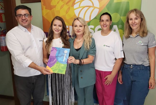Uma importante parceria foi firmada na manhã desta sexta-feira (31), entre a Fenasoja e a Lika Fashion - Indústria de Confecções, para a criação e confecção das roupas das recepcionistas da Fenasoja 2024. O contrato de cooperação foi assinado pelo presidente da feira, Dário Junior da Motta Germano e pela proprietária da Lika, Clarice Gelbhar. Acompanharam o ato, a presidente da Comissão de Eventos da Fenasoja 2024, Daiane Dutra e a designer da Lika, Alessandra Bertholdi.