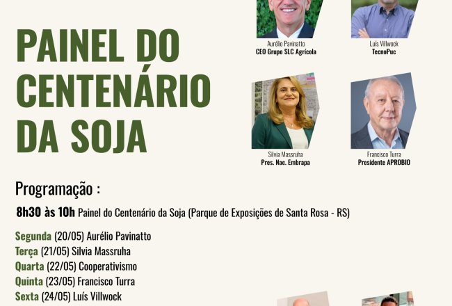 Entre os nomes está Aurélio Pavinatto- CEO SLC (dia 20/05), Silvia Massruha-presidente Nacional da Embrapa (21/05), Francisco Turra presidente Associação Brasileira das Indústrias de Óleos Vegetais (23/05) e Luís Vilwok-diretor da TecnoPuc (24/05). Ainda na quarta-feira (22/05) o Cooperativismo será destacado na programação com nomes relacionados ao setor, através de uma parceria da Sicredi, Cooperluz, Cotrirosa, Cresol e Coopermil. Os debates serão mediados pelos embaixadores da feira Paulo Hermann e Júlio Bravo e acontecerão de segunda a sexta-feira, das 08 às 10h da manhã, no parque de exposições.