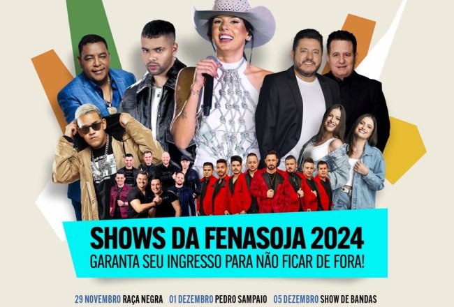 Segue a venda dos ingressos para os shows da Fenasoja 2024. A diferença desta edição é que mesmo pagando o ingresso de acesso ao parque, que custa R$10, o público que deseja assistir as atrações musicais na Arena deverá adquirir o acesso aos shows separadamente. Todas as entradas adquiridas para a edição de maio seguem válidas. O lote solidário para o setor pista ainda está disponível. É possível assistir a todos os shows por R$20 + 1kg de alimento. Esse lote é limitado e pode ser adquirido juntamente com os ingressos especiais, diretamente no site https://www.fenasoja.com.br/. Tem direito à meia entrada para os shows estudantes regularmente matriculados, mediante apresentação do documento comprobatório; idosos maiores de 60 anos apresentando documento oficial com foto; jovens de até 15 anos com documento oficial com foto; jovens de baixa renda entre 15 e 29 anos mediante apresentação da Identidade Jovem (emitida pela Secretaria Nacional da Juventude) e doadores de sangue com documento comprobatório expedido pelo Hemocentro ou bancos de sangue. Os shows iniciam na sexta-feira, 29 de novembro, com o Grupo Raça Negra. No dia 01/12 é a vez de Pedro Sampaio, dia 05/12 show de bandas com Corpo e Alma e San Marino, no dia 06/12 Bruno e Marrone, dia 07/12 Júlia e Rafaela e Dj GBR e encerra a grade no dia 08/12 com Ana Castela. Dúvidas sobre os ingressos podem ser esclarecidas através do whatsapp 55 99102-8875. A Fenasoja 2024 contará com 600 expositores e acontecerá de 29 de novembro a 08 de dezembro, no Parque de Exposições de Santa Rosa.