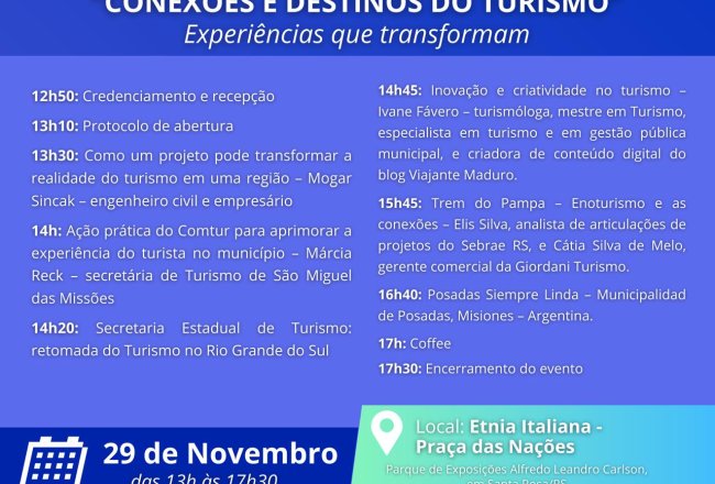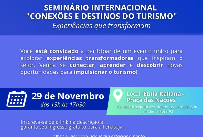 O turismo é uma das indústrias que mais cresce no mundo, trazendo oportunidades econômicas significativas, mas também desafios em termos de planejamento, sustentabilidade e impacto social. Pensando nisso, uma parceria entre Prefeitura Municipal de Santa Rosa e o Sebrae trará para a Fenasoja o Seminário Internacional "Conexões e Destinos Turísticos", que acontecerá no espaço da etnia Italiana, dia 29/11, das 13h às 17h30. O Seminário tem como objetivo compartilhar e disseminar experiências exitosas em inovação, promover a sustentabilidade e o respeito às culturas locais, além de fomentar a colaboração entre os diversos atores do setor. Especialistas compartilharão suas experiências e discutirão os desafios enfrentados.