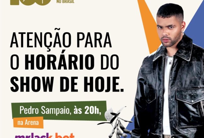 Na noite deste domingo, 01/12, Pedro Sampaio vai subir ao palco da Arena Mr Jack.Bet. A novidade do show é que está marcado para iniciar às 20h, diferente das demais atrações, que estão agendadas para às 22h. Ingressos antecipados podem ser adquiridos no site https://www.ingressonacional.com.br/fenasoja2024