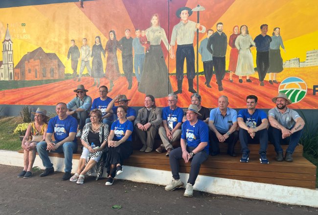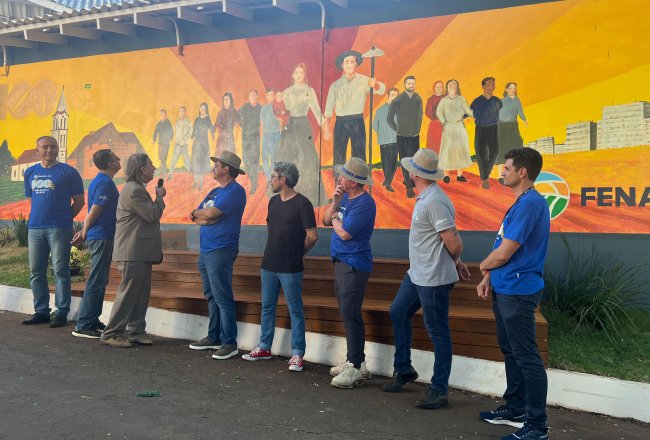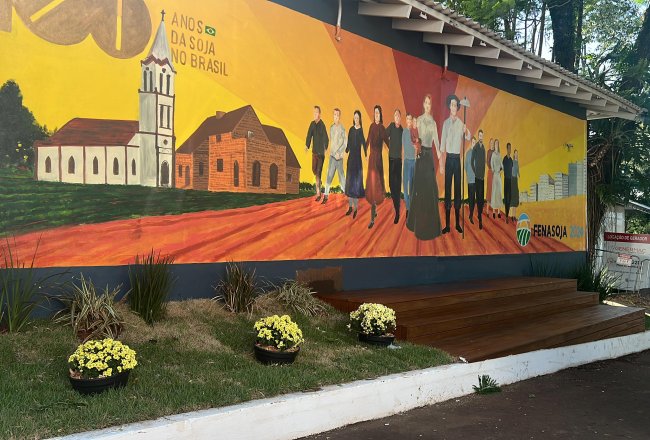 Foi inaugurado na tarde deste domingo, 1º dezembro, o mural que eterniza os 100 anos da Soja no Brasil, na parede da casa da Fenasoja, junto ao Parque de Exposições de Santa Rosa.