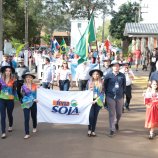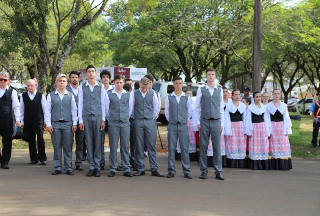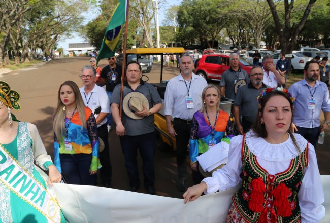 tarde de domingo, 29, teve desfile das etnias no parque de exposições. Com faixas