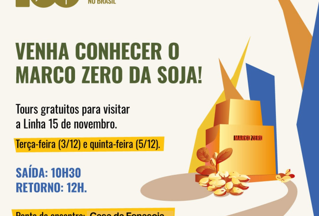 A Fenasoja 2024 promove a oportunidade dos visitantes conhecerem o Marco Zero e o Memorial da Soja, na Linha 15 de Novembro. O tour acontecerá na quinta-feira, 5/12, com saída às 10h30 e retorno às 12h. O ponto de encontro será na Casa da Fenasoja e a locomoção será feita pela Viação Ouro e Prata.