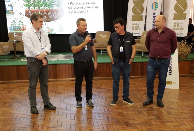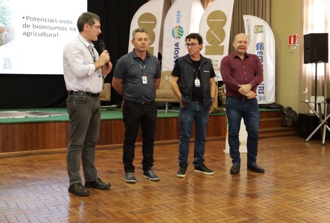 Agricultores e técnicos participaram nesta quarta-feira (04/12) de evento sobre bioinsumos, solução tecnológica que contribui para a produtividade e também para a sustentabilidade da produção agropecuária. A ação faz parte da programação da Fenasoja 2024, que segue até o próximo domingo (08/12), em Santa Rosa.