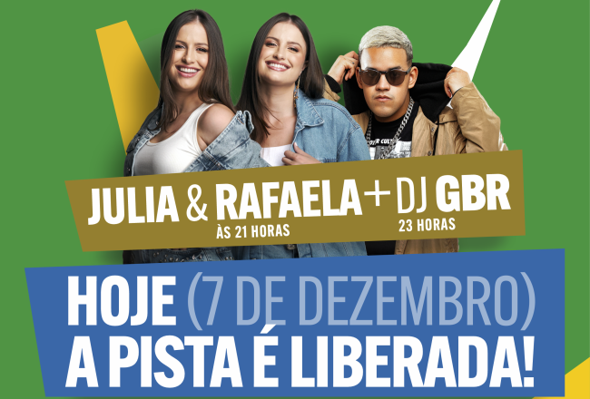 Às 21h, sobe ao palco a dupla Júlia e Rafaela e, após, às 23h, o show é com Dj GBR.