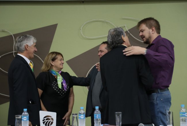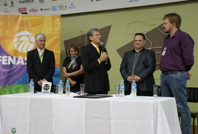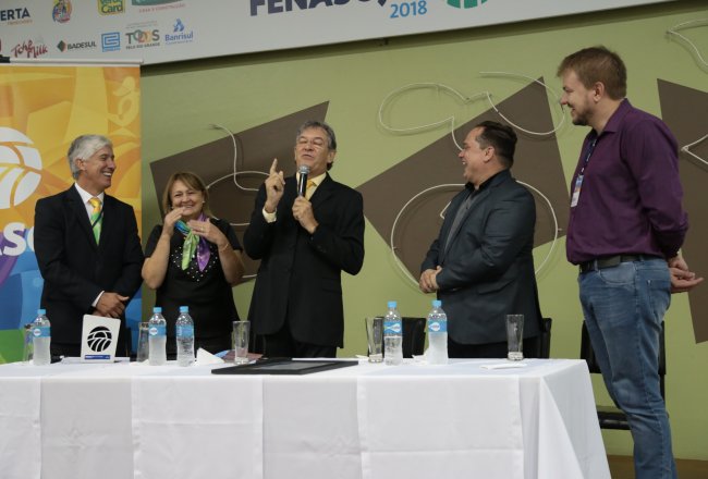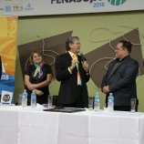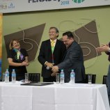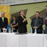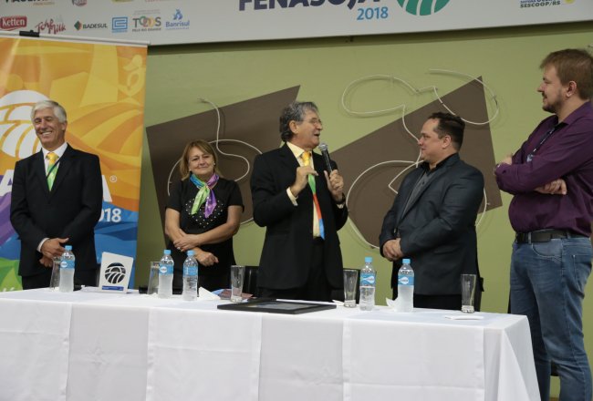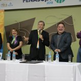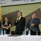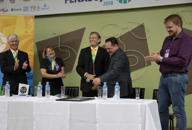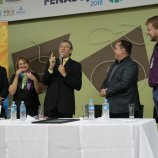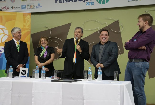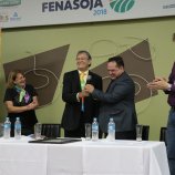 Ao final das homenagens, Dirceu Gassen recebeu das mãos do presidente da FENASOJA Alexandre Maronez, do presidente da Comissão de Cultura Vitor de Conti e do Secreetario de Cultura Rafael Rufino um quadro e uma placa para ficar de recordação.
